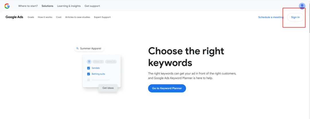 進入谷歌關鍵詞規劃師頁面,點擊右上角 “登錄” 選項。若沒有 Google Ads 賬號,需創建新賬號。