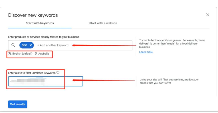 同時,可輸入獨立站網址,這樣能過濾掉與網站業務不相關的關鍵詞。完成信息填寫后,點擊 “Get results 獲取結果”。