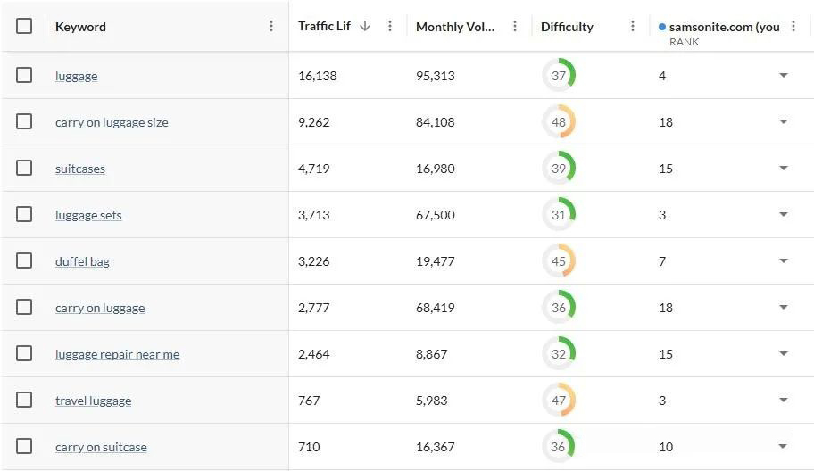 關鍵詞差距分析可能會讓人不知所措,火車時間顯示在出發板上,乘客前往 11 號站臺,但這是適合您業務的目的地嗎?現在你可以自信地回答這個問題,僅僅因為競爭對手對關鍵詞有排名并不意味著它與你的網站相關或有利可圖。默認情況下,Keyword Gap 2.0 專注于您已經排名但還有改進空間的關鍵字。請考慮 Samsonite 示例中的以下結果: