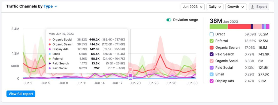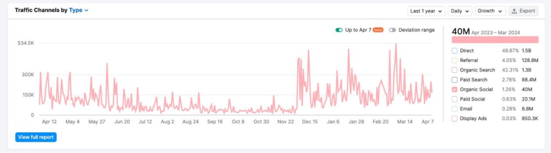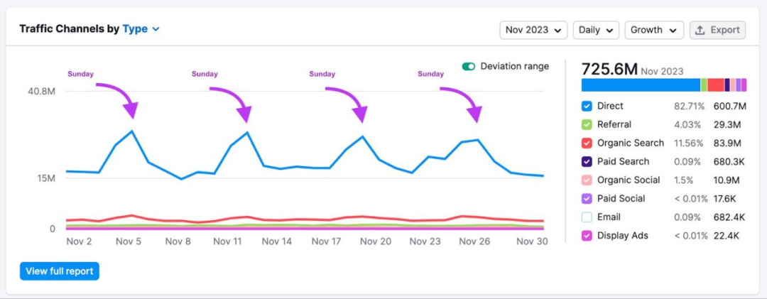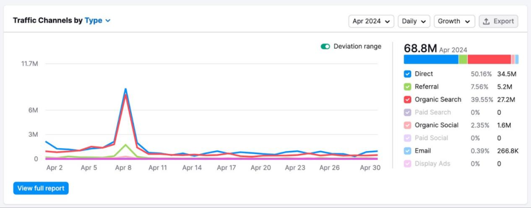 查看Traffic Channels by Type圖表,分析競爭對手流量波動的原因。流量飆升可能意味著他們意識到并抓住了市場機會,而流量急劇下降可能代表他們的決策出現失誤,或者競爭對手的舉動損害了他們的利益。