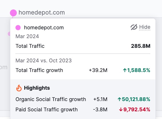Traffic Analytics中查看流量來源圖表,觀察自然搜索流量的增長趨勢。如果不是一次性的激增,而是有規律的增長,說明homedepot.com在這一渠道上實施的策略是長期有效的。