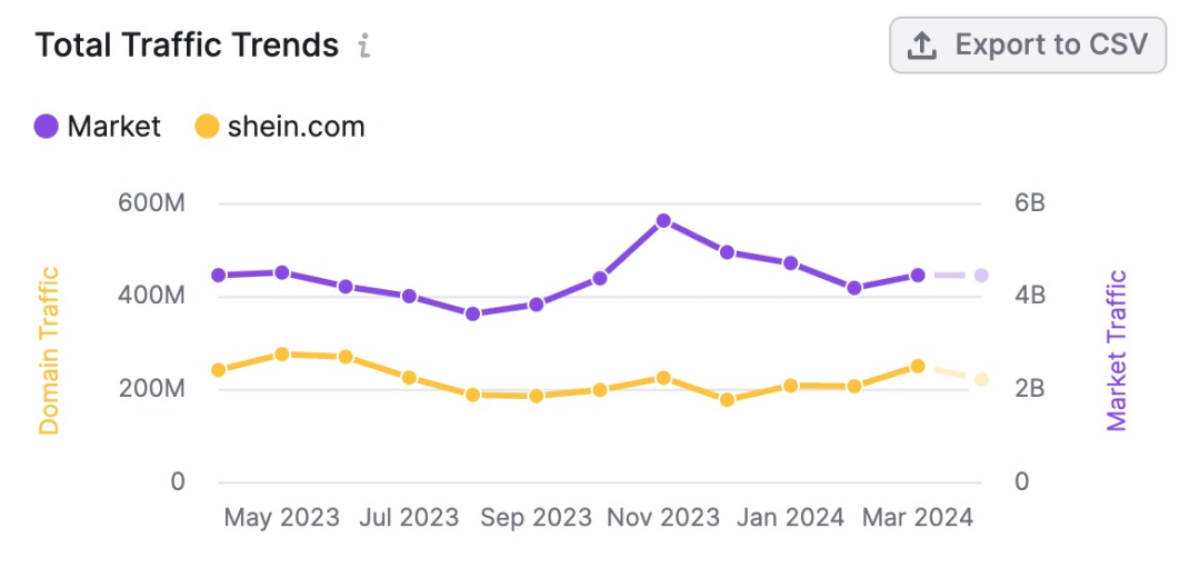 選擇一個細分行業或一批域名,查看Total Traffic Trend(總流量趨勢)圖表,紫色曲線展示了整體市場的流量變化趨勢。
