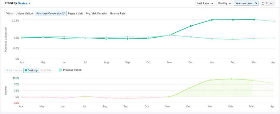 在Trend by Device圖表中選擇Purchase Conversion的指標,觀察過去一年的轉化率變化趨勢。如果這一趨勢與流量增長趨勢保持一致,表明步驟二中的策略確實奏效。