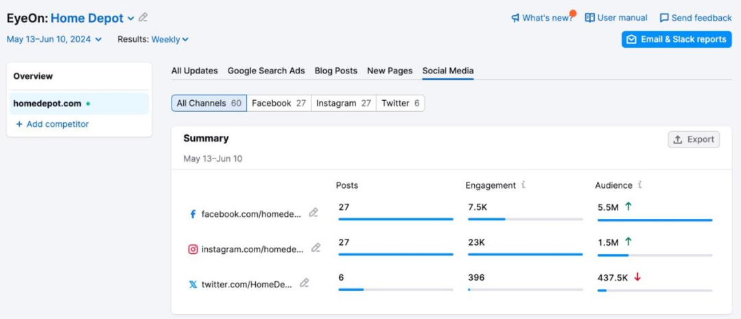 Homedepot.com 的自然社媒策略舉例,EyeOn能夠跟蹤他們的社交媒體活躍度以及與受眾的互動表現,你可以清楚的看到他們發布了什么內容以及跟受眾互動的情況。