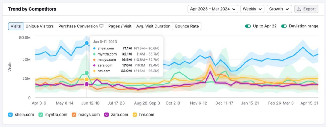 對市場上的領軍者進行調研,深入了解他們基于市場大環境而采取的營銷策略。在Traffic Analytics中輸入市場上的幾家頭部公司域名,查看Trend by Competitors圖表,了解他們流量的高峰和低谷。