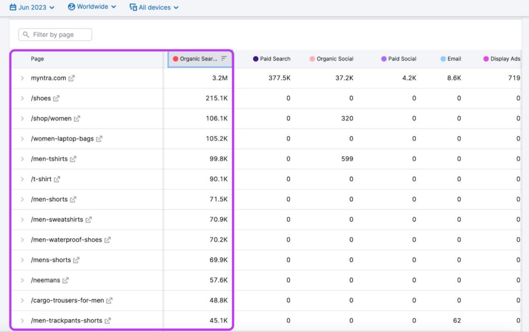 確定競爭對手的主要流量渠道后,前往Traffic Analytics,獲取Top Pages report,了解哪類內容、促銷或產品頁面的市場參與度最高。