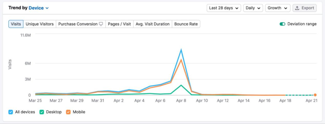 用流量趨勢圖觀察競爭對手過去一年的流量趨勢,可以發現市場中的特殊事件。如果你知道某個事件即將發生,那么跟蹤日常流量,了解其變化趨勢。