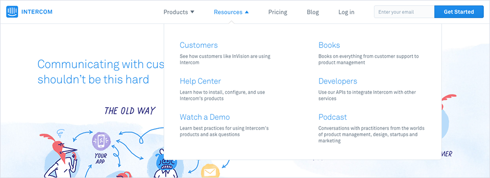 以Intercom為例,它是一款大型CRM應用,公司旗下有三大子產品。官網首頁設置了5個一級導航,其中前兩個是折疊導航。最重要的Products導航的下拉菜單中按照產品和解決方案兩個維度展示了對應的信息。配合icon和簡介,有序又直觀: