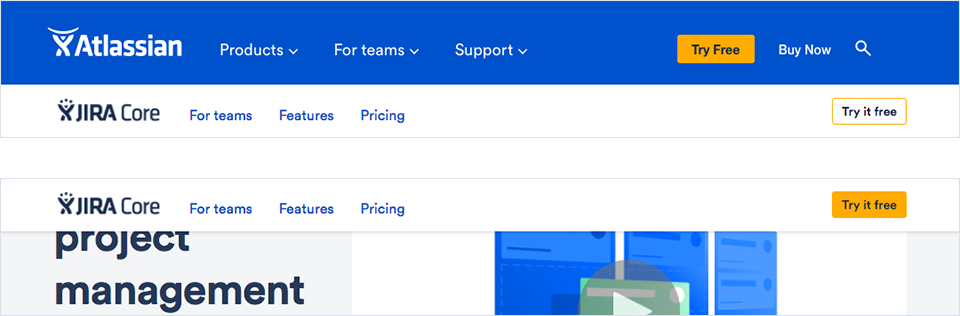 再看看Atlassian的設計。到達子產品頁后會保留主導航,隨著頁面滾動,子產品導航會把主導航推出,繼而代替主導航的位置: